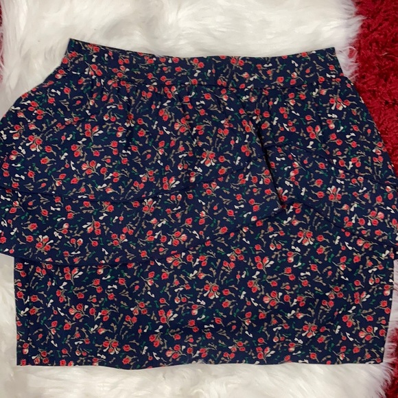 Floral Mini Skirt / Ruffle Navy Blue Size M Silk Material