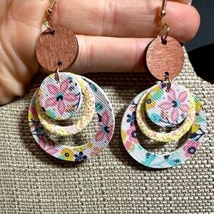 Floral Multi-Color Hoop Earrings with Gold tone Hooks. PU Leather