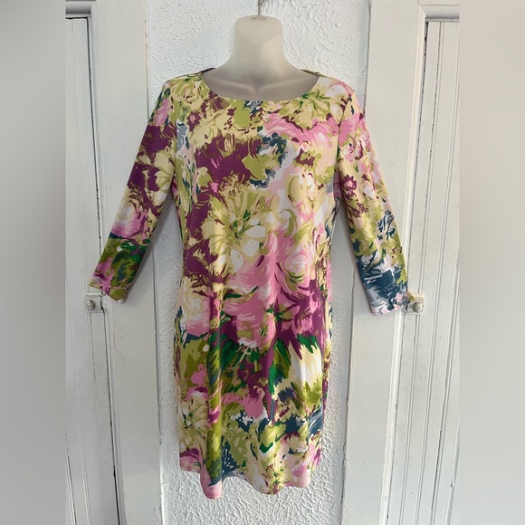 Embrace vibrant style with this stunning floral dress. Perfect for any occasion, it features a beautiful blend of pink, green, and purple hues. Add a splash of color to your wardrobe today. Very soft and stretchy.