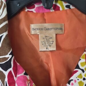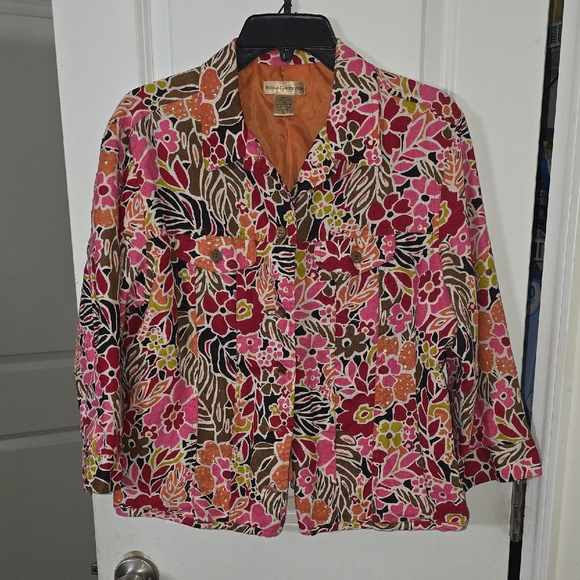 Vibrant floral jacket with pink, orange, and brown hues. With beautiful iridescent details (see pictures). Perfect for a bold statement.