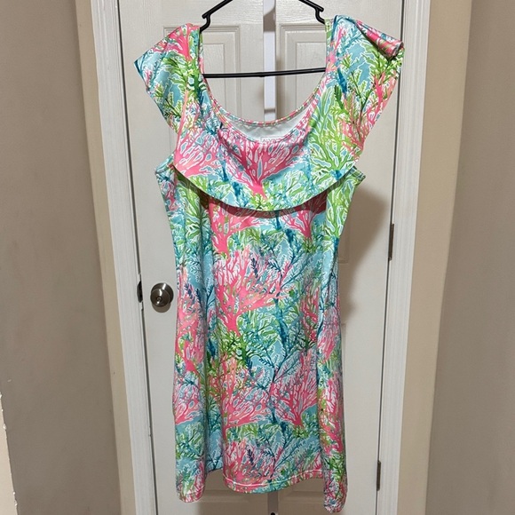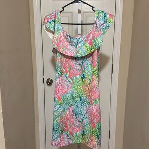Brighten your wardrobe with this vibrant floral dress. Featuring a playful ruffle neckline, it's perfect for any occasion. The multicolor design includes shades of pink, blue, and green, adding a fresh and lively touch.