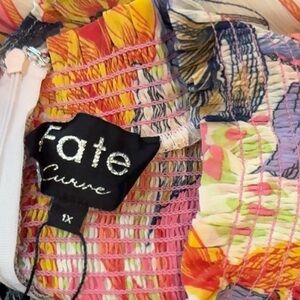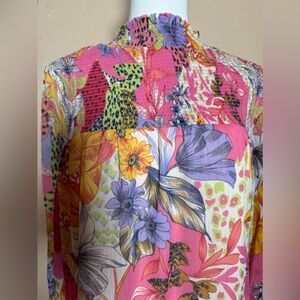 Bright smocked dress with floral patterns. Features pink, yellow, and blue tones.