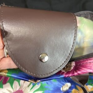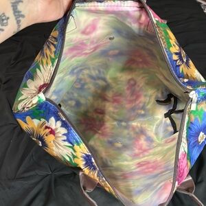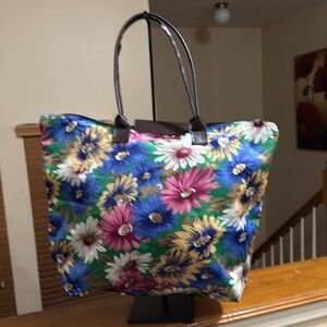 This vibrant floral tote bag is perfect for adding a pop of color to any outfit. Featuring a stunning mix of blue, green, pink, and yellow hues, it's both stylish and functional. In gently used condition. Handles are brown faux leather. Fold up nicely for easy storage. Very pretty tote bag!