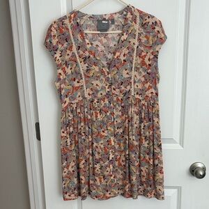 This vibrant tunic top features a beautiful floral pattern in a mix of colors. Perfect for adding a pop of color to your wardrobe. Button front.