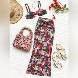 Vibrant floral set with a bow detail. Features a mix of red, pink, blue, and green colors.