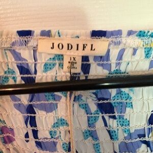 Beautiful floral top with a multicolor leaf pattern. Features shades of blue, purple, and green.