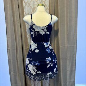 Elegant navy blue wrap dress with white floral pattern. Perfect for any occasion.