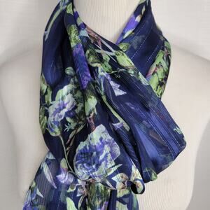 Floral Navy, Green, Purple Semi-Sheer Long Scarf in Silky Fabric