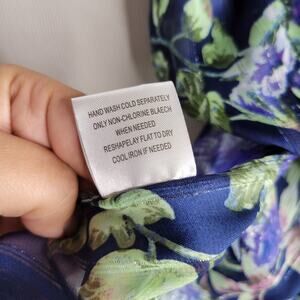 Measurements: 19 x 72". Gorgeous scarf has a lovely blend of colors in its floral print. The fabric has a tonal sheer stripe and a silver metallic thread through it. 99% polyester. Perfect way to dress up a basic navy dress or coat.