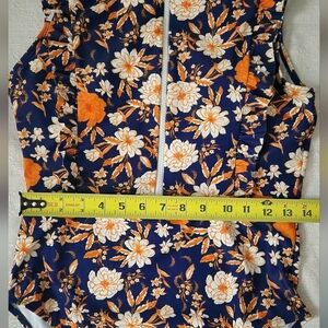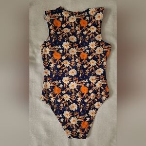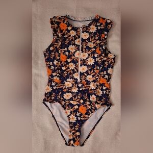 Charming floral one piece swimsuit in navy with vibrant orange and white accents. Perfect for a fun day at the beach.