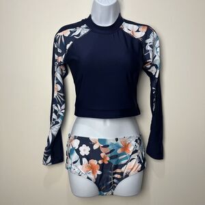 Dive into style with this elegant floral navy swim set. Perfect for a day at the beach or pool.