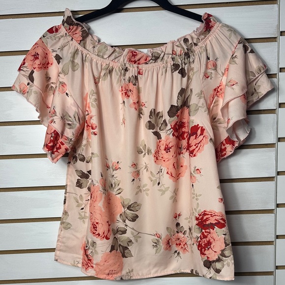 Embrace elegance with this floral off-shoulder ruffle top. Perfect for any occasion, this pink top adds a touch of femininity to your wardrobe.