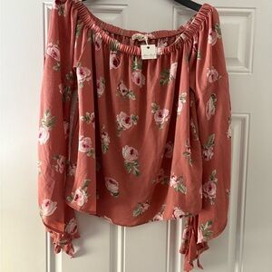 Embrace elegance with this floral off-shoulder top. Perfect for any occasion, this top features a beautiful pink hue with delicate floral patterns. A must-have addition to your wardrobe.