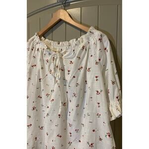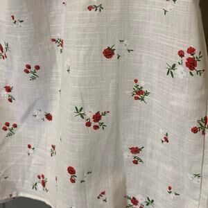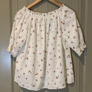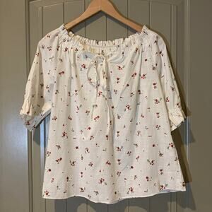 Off the shoulder, shirred top with red flowers throughout. Front tie, ribbon. Size and care tag removed. Please refer to approximate measurements below for sizing. Fits like a medium and feels like linen-blend. Very pretty, cottage core top.