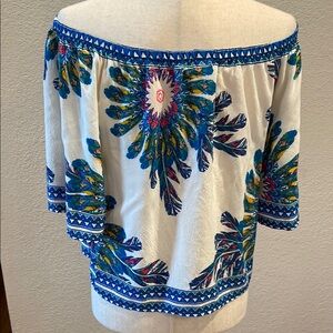 This stylish off-shoulder top features a vibrant floral design. The blue and ivory colors create a fresh and trendy look, perfect for any casual outing.