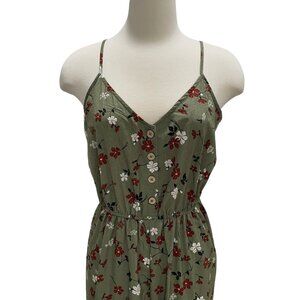Floral Olive Green Spaghetti Strap Jumpsuit With Ruffle Hem & Button Detail