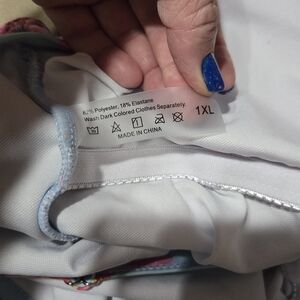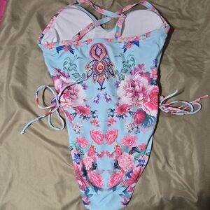 Vibrant floral one-piece swimsuit with pink and blue hues. Features a stylish design with adjustable straps. Gently used!