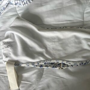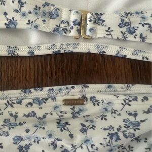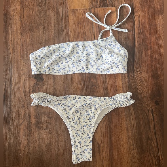 Embrace summer with this stylish floral one-shoulder bikini set. Perfect for beach days, this swimwear features a delicate blue floral pattern on a white background, offering a chic and fresh look.