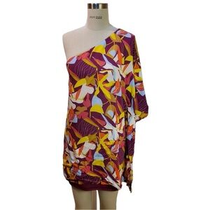 Vibrant floral one-shoulder dress featuring a mix of pink, yellow, and white hues. Perfect for a stylish and bold look.