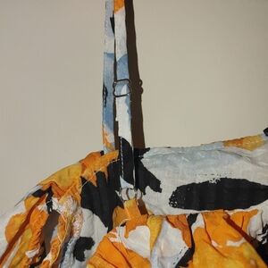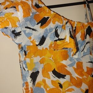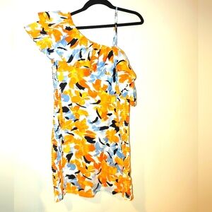 Vibrant floral one-shoulder dress with a mix of colors. Perfect for a summer outing.