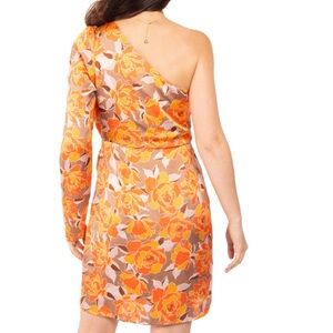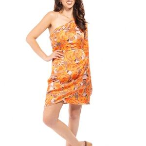 Embrace elegance with this stunning floral one-shoulder dress. The vibrant orange and pink hues create a captivating look. Perfect for any occasion.