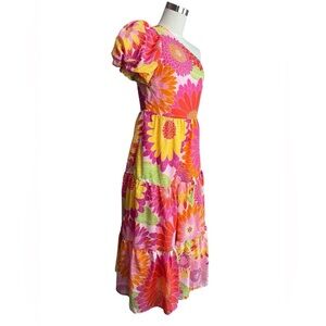 Embrace vibrant style with this floral one-shoulder midi dress. Perfect for any occasion, this dress features a stunning mix of pink, yellow, and green hues. Stand out with its unique design and bold colors.