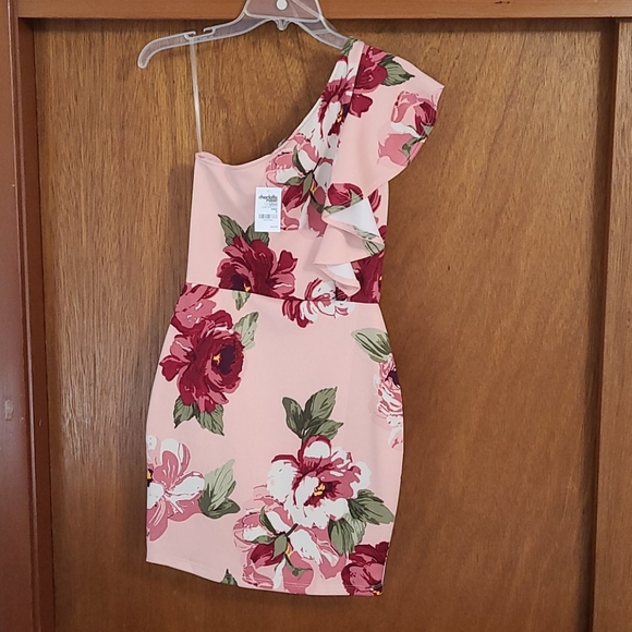 Beautiful blush pink floral dress with one-shoulder ruffle detail.