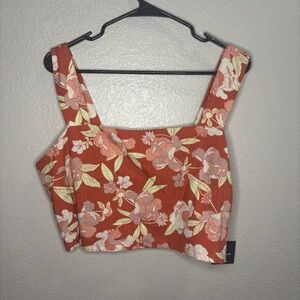 Stylish floral crop tank top with button details. Features vibrant red with floral design. Ideal for summer!