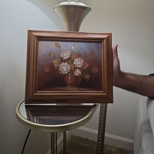 Enhance your home with this elegant floral painting, featuring a rich brown frame. Perfect for adding a touch of nature to any room.