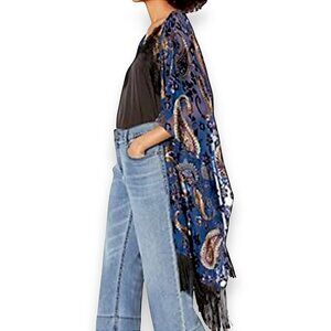 Floral Paisley Mid Length Open Front Fringe Tassel Velvet Kimono Cardigan - NEW