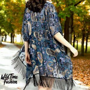 Elegant layering year round attire! Velvet burnout black Black, dark blue floral with golden yellow paisley mid-length fringe tassel kimono cardigan! Y2K, bohemian, to retro chic fashion luxe burnout stylish layering staple!