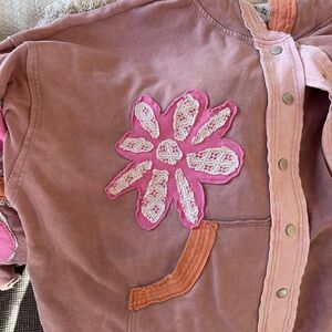 Charming jacket featuring floral patchwork design. Perfect for adding a pop of color to any outfit. small mark showing in the last two pictures.