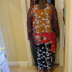 Vibrant floral patchwork long coat with button details. Features a mix of red, black, and orange patterns. pit to pit is 24 in. 2 side pockets. never worn, brand new.