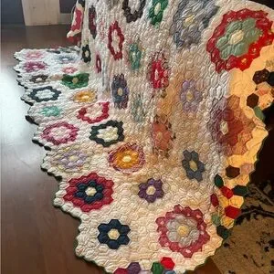 Gorgeous! Vintage! Family piece! Add a touch of charm to your bedroom with this beautiful floral patchwork quilt. Featuring a vibrant mix of colors, this quilt is perfect for adding warmth and style to your home bedding collection. Hand pieces hand quilted does have some wear. This quilt was found in the attic. Has a few rips and stains. Photographed!