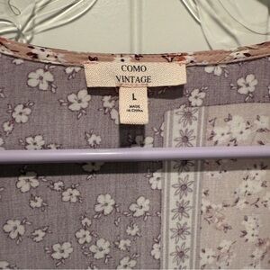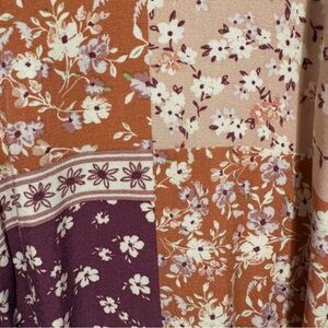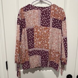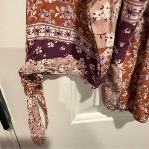 Embrace bohemian style with this floral patchwork wrap top. Featuring a blend of purple and brown hues, this top is perfect for a casual day out. Cute Ties at end of sleeves .