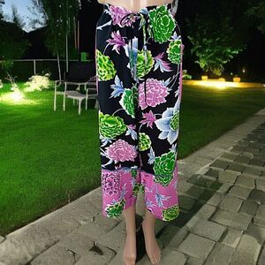 Floral Patchwork Wide Leg Pants M Hippie Artsy Boho Chic Fairy Flowy Drawstring. Condition is pre-owned with no rips, tears, holes or discolorations. There is ONE missing sequin on the leg. Elastic drawstring waist. No stretch. Made by Soft Surroundings. Very flowy and relaxed. All Rayon. PLEASE SEE MEASUREMENTS!!