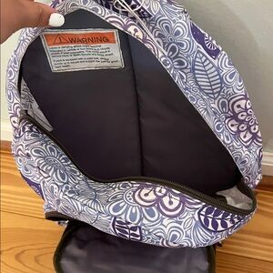 Stylish backpack with a floral pattern. Features shades of purple and gray.