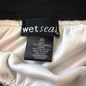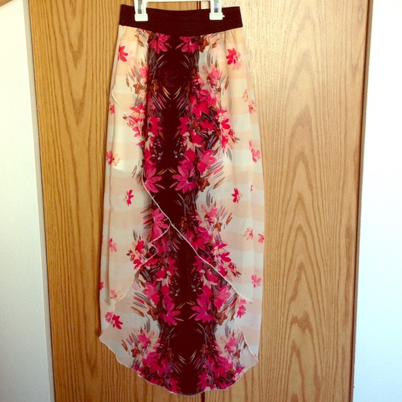 This cute high-low skirt is perfect for spring! Elastic waist, white slip underneath. Peach background with magenta floral pattern. Very small tear in waistband seam- not noticeable. Worn just once!