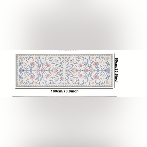 Beautiful runner rug with a floral pattern. Features shades of blue, pink, and cream.