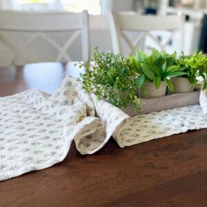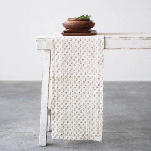New Floral Pattern Table Runner, featuring a charcoal gray and cream floral print. The soft, muted tones make it a versatile piece. Greenery NOT included