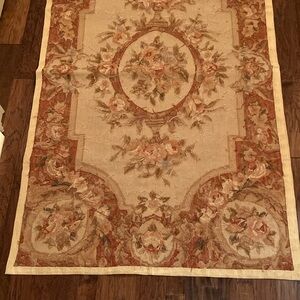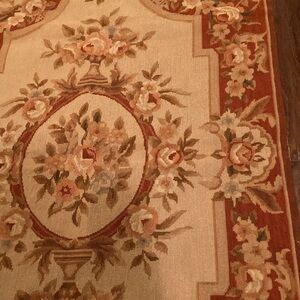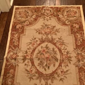 Elegant area rug with a floral pattern. Features shades of cream, tan, and brown. 3 x 5