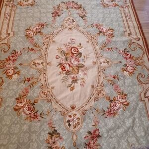 Elegant area rug with intricate floral patterns. Features soft hues of green, cream, and brown.Measurements are 69 inches by 45 inches All done with wool stitching