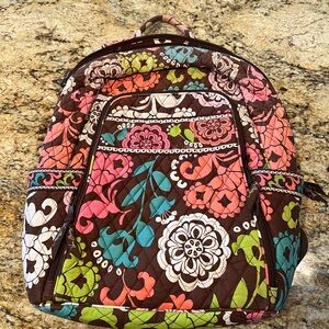 Stylish and vibrant floral patterned backpack perfect for everyday use. Features a mix of pink, green, and brown colors for a trendy look. Signs of heavy use on the bottom/back (see last picture).