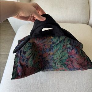 Elegant clutch with a vibrant floral pattern. Features a mix of red, green, and blue hues. Perfect for bread or produce.