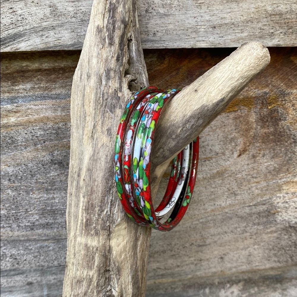 Charming vintage Cloisonné bangles with floral patterns in red, green, and white. Ideal for a colorful touch.
