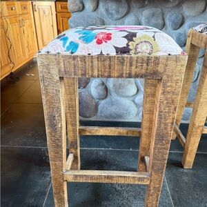 Set of two bar stools with a vibrant floral pattern. Features a mix of pink, blue, and brown colors.