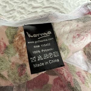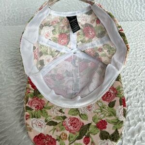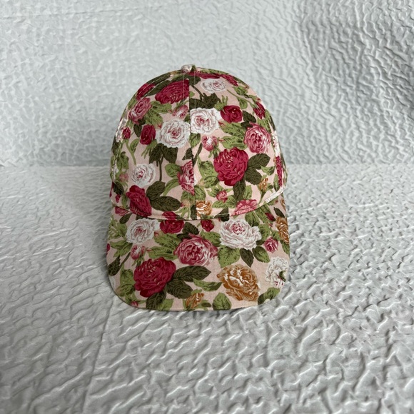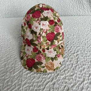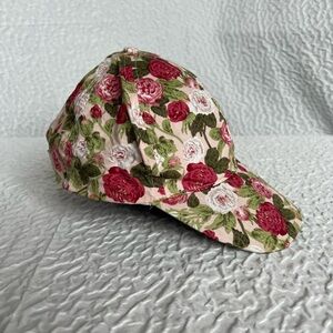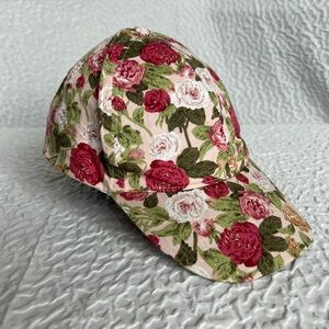 Chic cap with floral design. Features red, pink, and green hues. Ideal for casual wear.