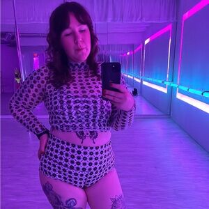 Savage X Fenty booty shorts and sports bra. Great for dancing, yoga, or just feeling cute around the house. I wore them for pole dancing, but only wore the shorts once and the bra maybe 3 or 4 times. Both are like new. Please note this is for the set, minus the turtleneck.