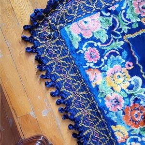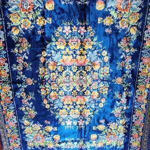 Vibrant blue area rug with intricate floral patterns. Features colorful flowers in orange, pink, and green.