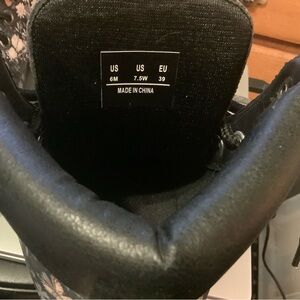 Stylish boots with a floral pattern. Features black laces and a sturdy sole.